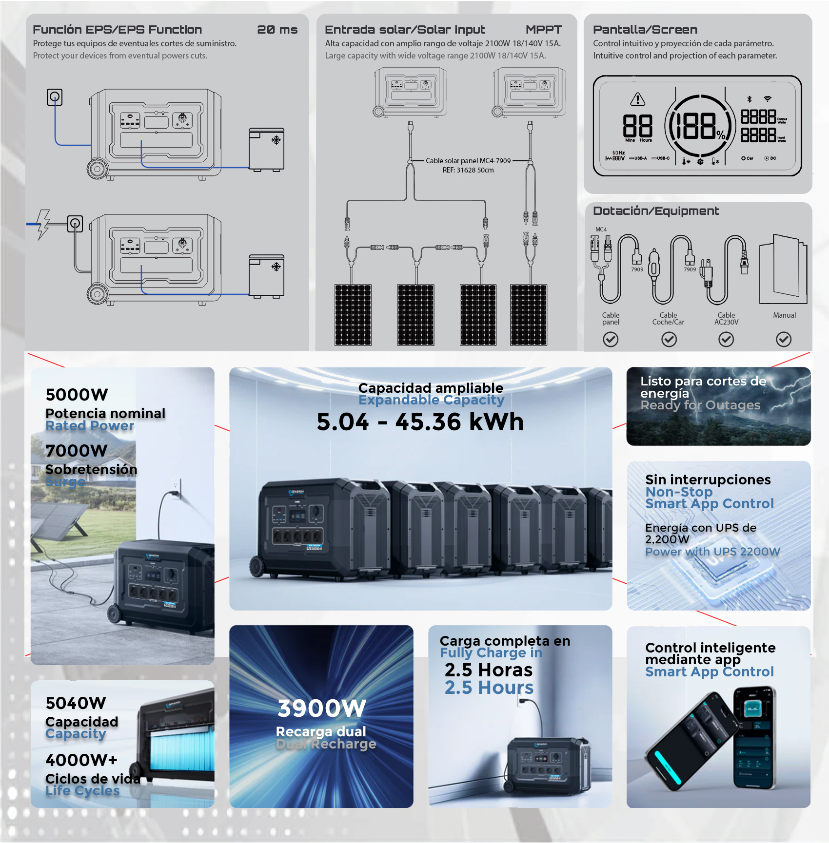 De plus, il permet une extension avec jusqu'à 4 batteries supplémentaires de 5040 Wh, pour atteindre une capacité totale de près de 25 kWh, ce qui est idéal pour les projets de longue durée ou les besoins énergétiques à forte demande.