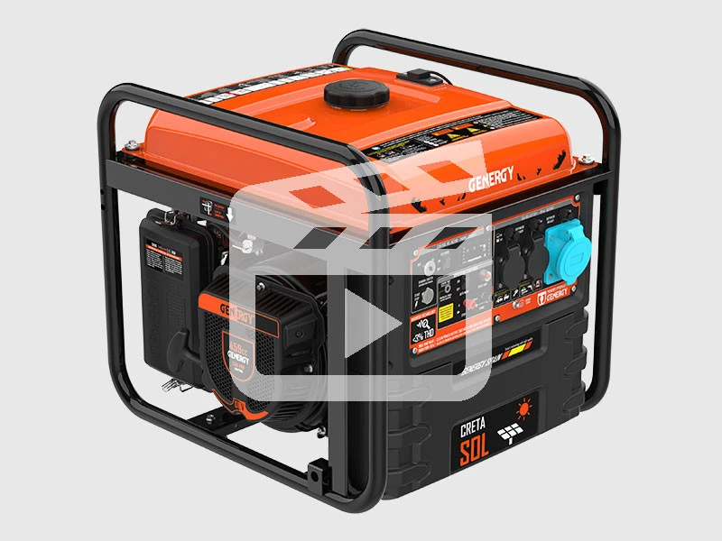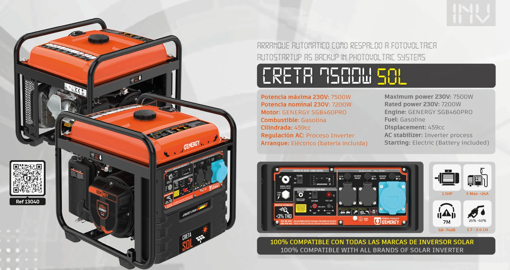 El generador inverter Creta Sol muestra voltaje, frecuencia, horas de uso, potencia en uso y nivel de combustible.